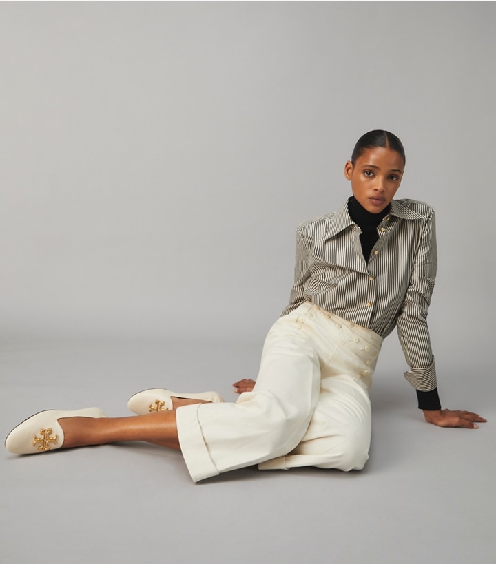 Signature hardware, scaled-up and sculptural. Based on a traditional Venetian slipper, the Eleanor Loafer is made of soft leather with a ruched back. A cushioned footbed with a small interior wedge adds comfort and slight lift.