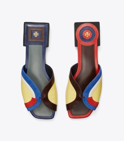 An abstract-inspired design, utilizing a meticulous assemblage of leather. Our Marquetry Slide is a modern pairing of colors and shapes, with a low heel and cushioned leather footbed.
