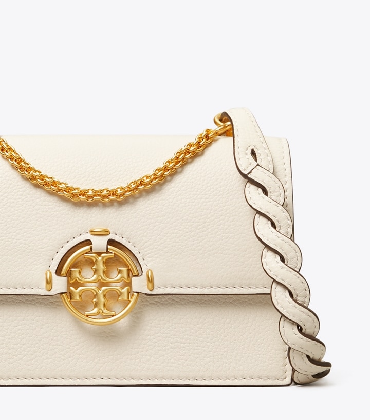 A striking expression of workmanship and artistry. Hand-woven braiding. Artisanal stitching. Natural-grain leather with our signature Double T. The Miller Mini Bag is designed with an adjustable crossbody strap and a removable gold chain. The gusseted shape opens to multiple compartments, including two card pockets.