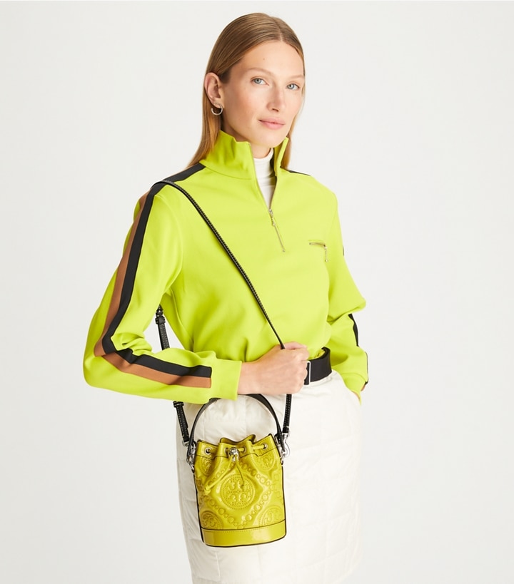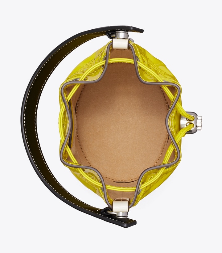 The Mini Bucket Bag, in our signature T Monogram inspired by traditional Pennsylvania Dutch quilting, is crafted in embroidered patent leather. When worn crossbody, the top handle falls naturally. Our metal logo cord stopper works as a keeper for the drawstrings. Press and hold the Double T down while guiding the drawstrings through