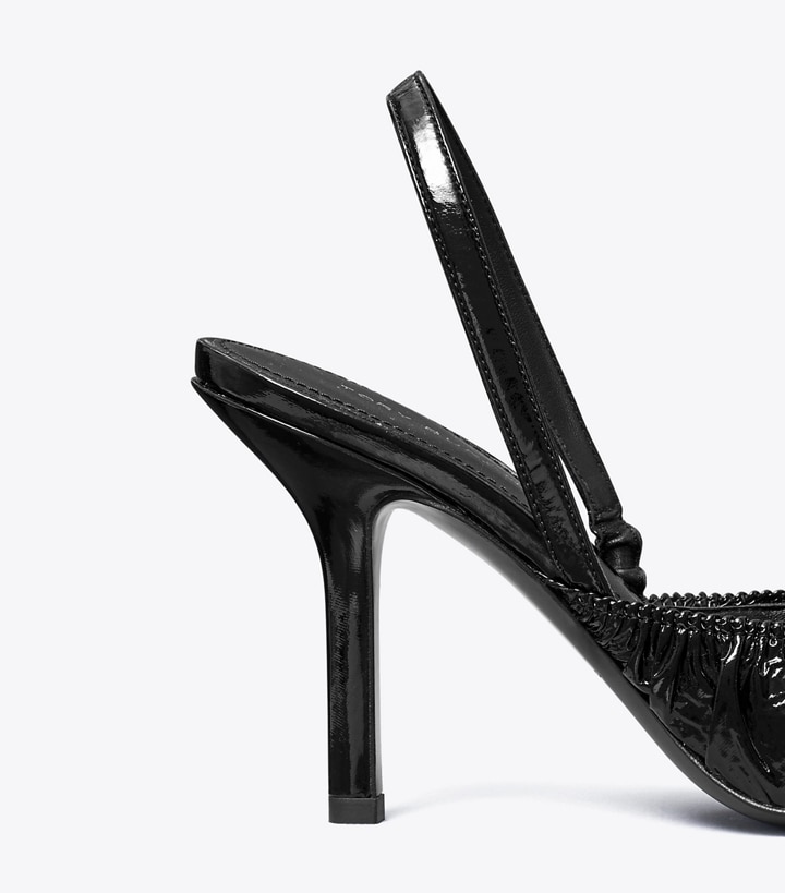 The classic slingback, with a textural twist. Our runway pump combines patent leather with delicate ruching and a chic pointed toe. Wear it with the season's tromp l'oeil skirts and tailored trousers.
